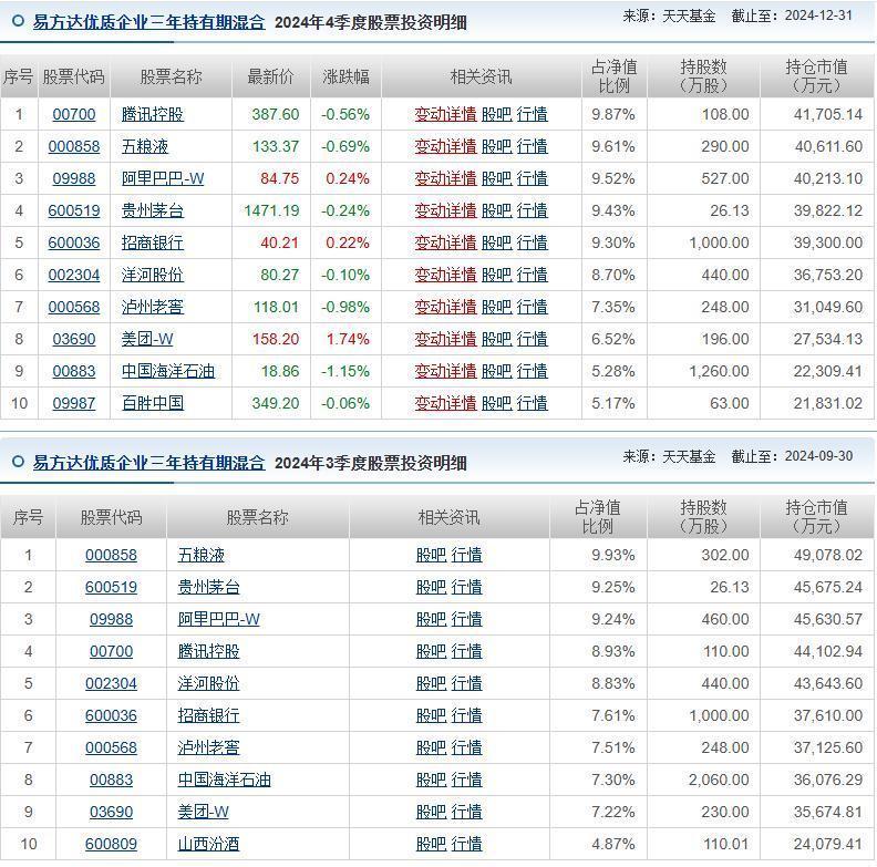 易方达优质企业前十大重仓股中新进了百胜中国,减持了中海油、美团,小幅减持了腾讯和五粮液(000858);并且增持阿里巴巴67万股。