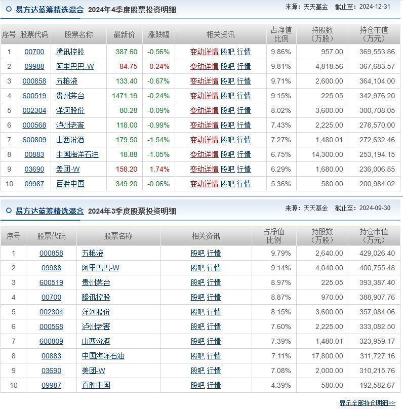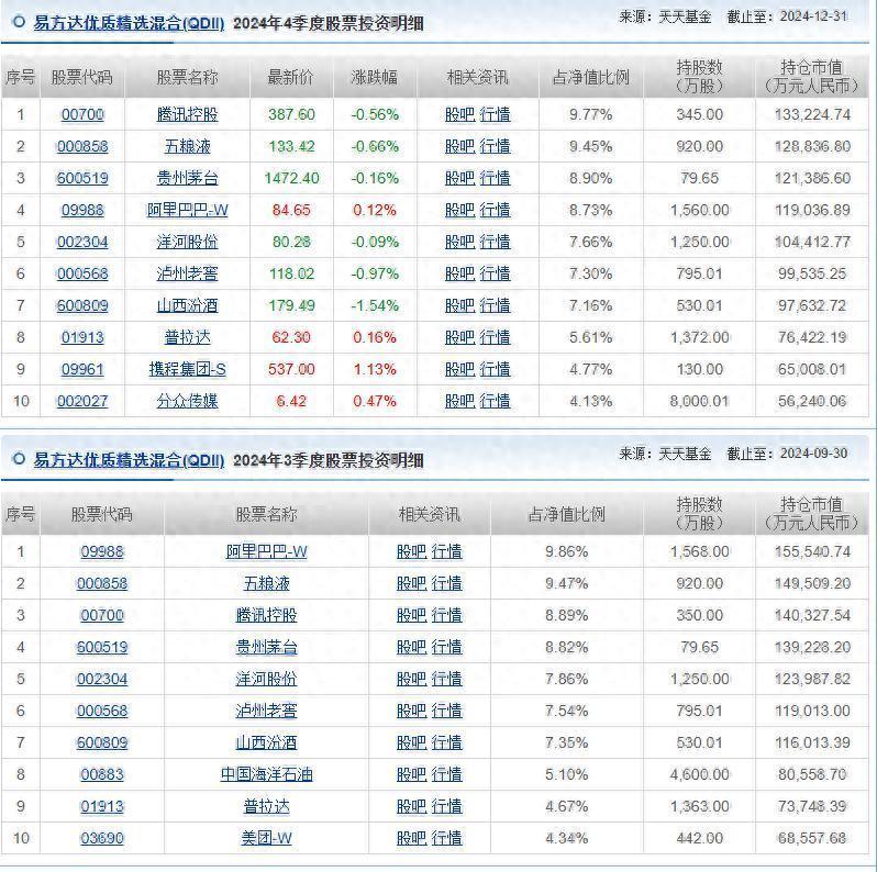 易方达蓝筹四季度重仓股没有进出变动,仅大幅加仓了三季度阿里巴巴,共778.56万股。