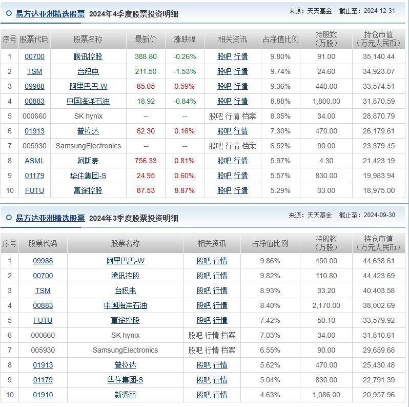 从易方达亚洲精选的重仓股来看,大笔减持了中海油、富途控股,还小幅减持了腾讯、台积电、阿里巴巴,新秀丽退出前十大重仓。